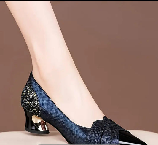 Deep bleu Pointed Toe mid heeled pump elegant with golden accents upper rubber sole for office