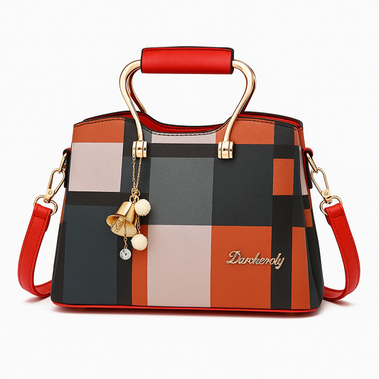 Plaid Charm Structured Handbag – Elegant Shoulder Bag with Top Handle & Gold Accents